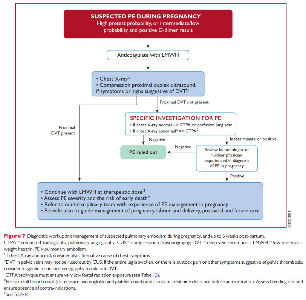 - Use Pregnancy-Adapted YEARS (NEJM 2019) to rule out PE with a low probability and D-Dimer <1000. Pregnancy-Adapted YEARS Algorithm for Diagnosis of Suspected Pulmonary Embolism. Adjusted D-Dimer allowed reduced CT utilization (61%) compared to a similar algorithm without an adjusted D-dimer (84%)- (Righini M, Robert-Ebadi H, Elias A, et al. Diagnosis of pulmonary embolism during pregnancy: a multicenter prospective management outcome study. Ann In- tern Med 2018;169:766-73).