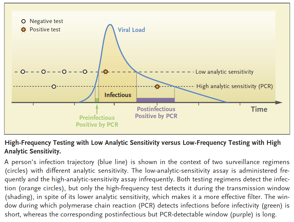 - the key is frequent testing to catch someone early in their period of transmissibility to break chain of spread.