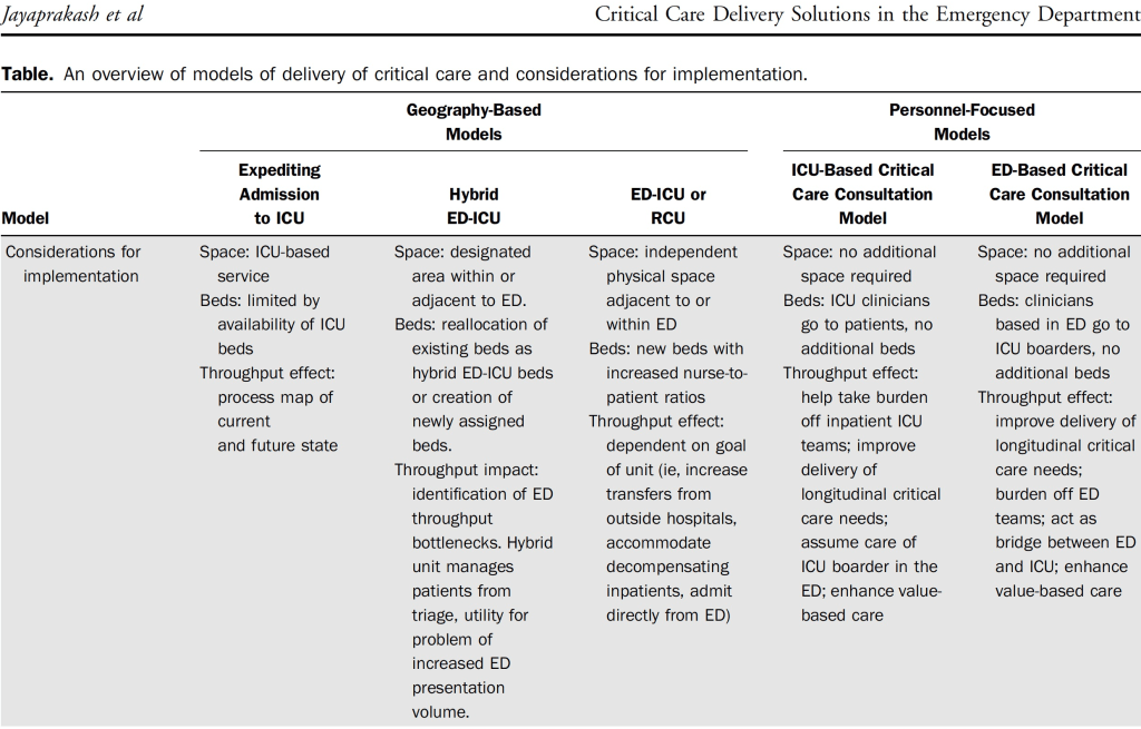- 5 models to respond to boarding, easiest is the far right Ed-Base Critical Care Consultation Model.