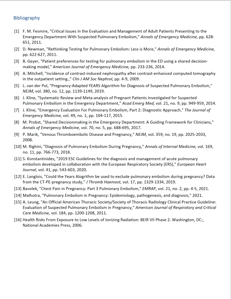 For many emergency clinicians, the NEJM publication of van der Pol’s Pregnancy-Adapted Years Algorithm for Diagnosis of Suspected Pulmonary Embolism in 2019 was all we needed to begin offering patients an alternative to mandatory CT for all low risk PE workup. Righini had already published a Pregnancy PE protocol that employed risk assessment with a normal D-Dimer but unfortunately this only reduced CT utilization in 22% of pregnant patients.