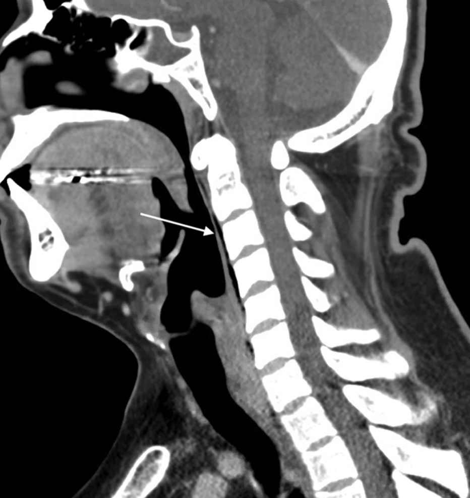 - A 30-year-old man presented to the emergency department with throat pain and oral intolerance of fluids for several hours. Earlier that day, an outpatient operation was aborted after multiple unsuccessful intubation attempts in the operating room. The patient had unremarkable vital signs, noting only odynophagia. Computed tomography (CT) of the neck and an esophagram with water-soluble contrast were acquired.