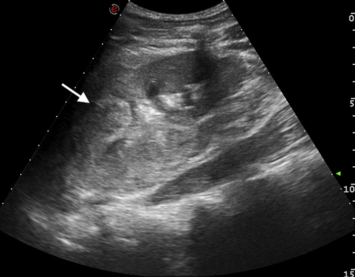 - An abdominal ultrasonographic scan showed major left kidney trauma (Figure 1). A computed tomographic (CT) scan confirmed a grade IV renal laceration, according to the American Association for the Surgery of Trauma classification (Figure 2).