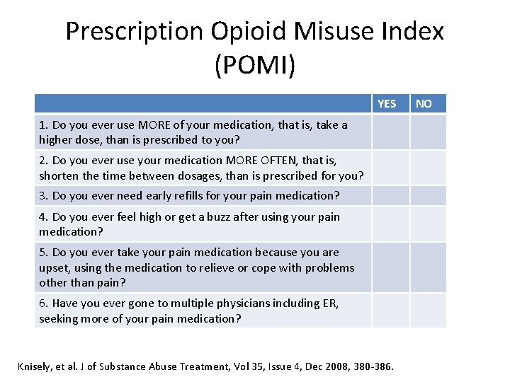 - Prescription Opioid Misuse Index is 82% sensitive and 92% specific with a score >/=2.