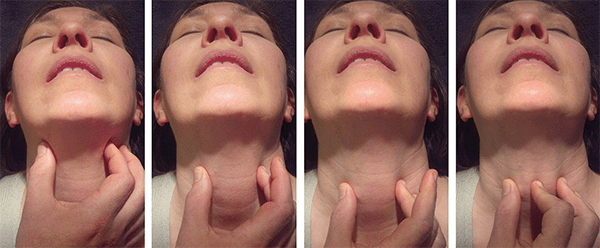 The “laryngeal handshake,” from left to right: 1) hyoid, 2) thyroid, 3) cricoid, and 4) palpation of cricothyroid membrane.