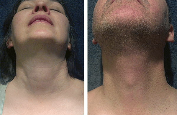Female versus male external anatomy: The thyroid prominence is evident in the male, whereas the thyroid and cricoid have equal prominence in a female.