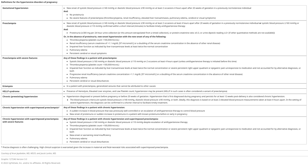 - New onset of systolic blood pressure ≥140 mmHg or diastolic blood pressure ≥90 mmHg on at least 2 occasions at least 4 hours apart after 20 weeks of gestation in a previously normotensive individual or systolic blood pressure ≥160 mmHg or diastolic blood pressure ≥110 mmHg confirmed within a short interval (minutes) to facilitate timely antihypertensive therapy