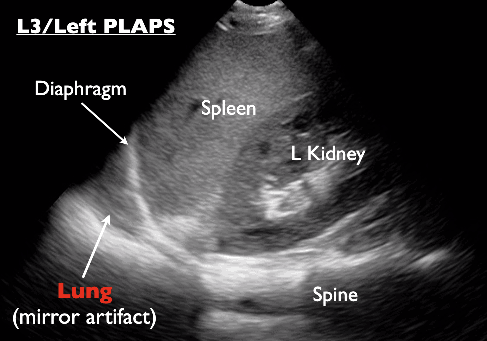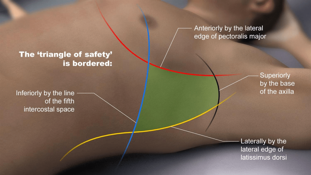 - Always use ultrasound to confirm you’re on the pneumothorax side and confirm you are above the diaphragm and no adhesions or vessels , mark with an X.