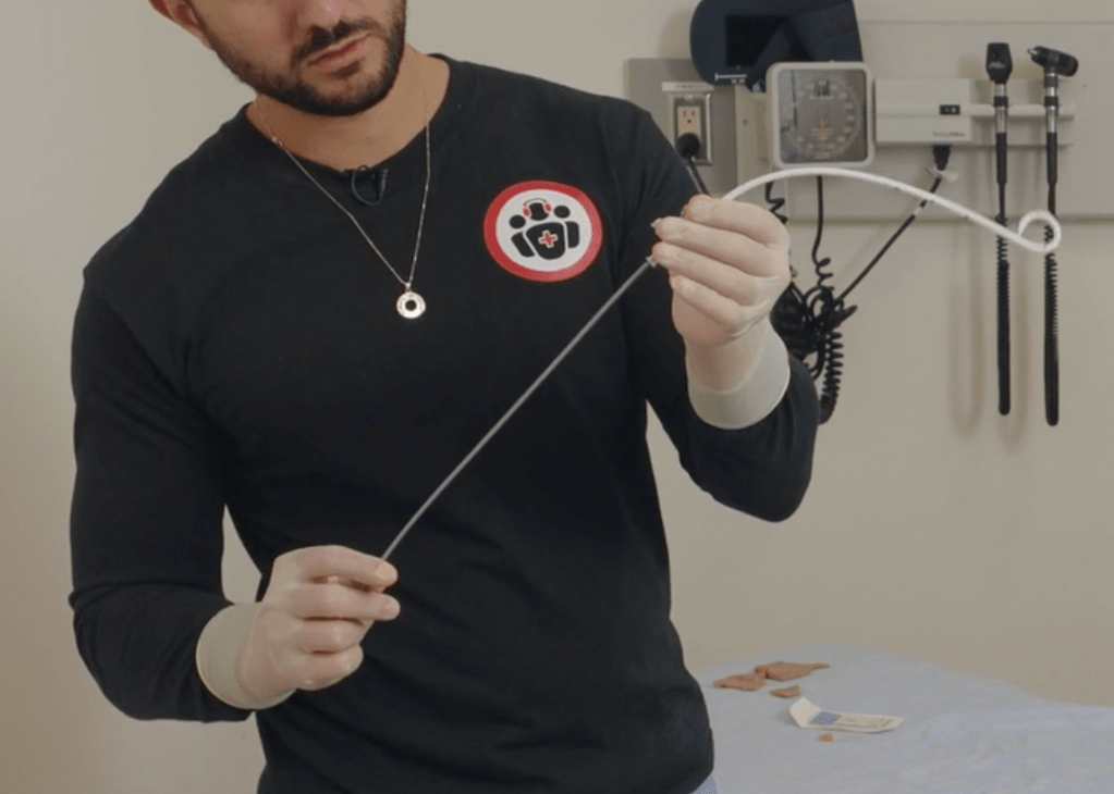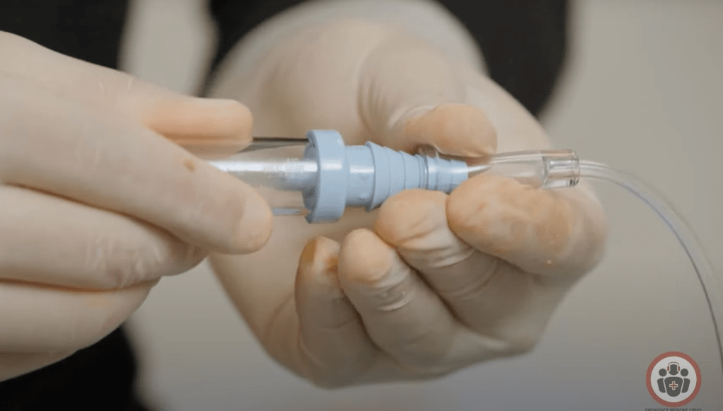 - Connect the Blue side of the Heimlich valve to the pigtail catheter to ensure air flow is out of the thorax (there is writing on the valve that directs you if you forget).