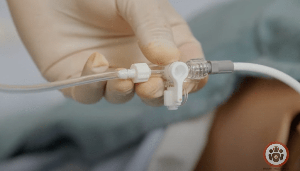 - Make sure the stopcock direction is off to the side port, as pictured above, so that it is open to the tubing going to the pleur-evac.
