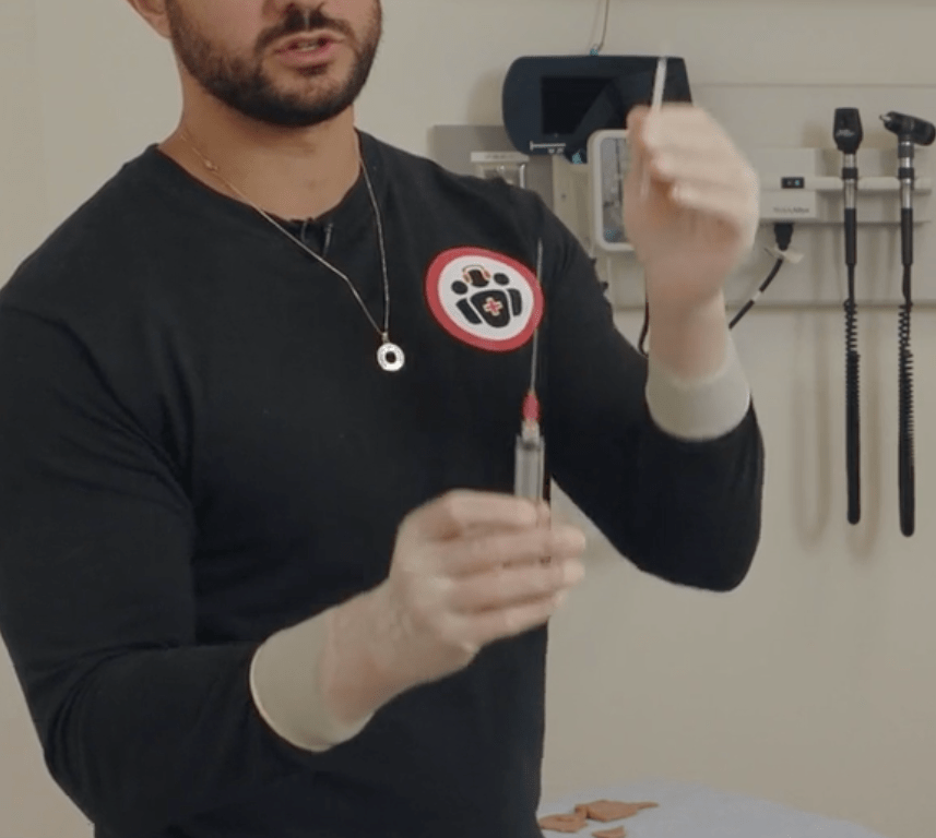- Suture the pigtail in place: Take a bite of tissue and throw three knots, leaving two long tails, then wrap those tails snugly around the catheter and throw three more knots.