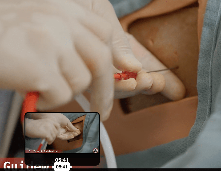 - Advance short dilator over the wire, then twist, pull and pinch (twisting on the dilator as you pull back on the dilator which allows dilator to grab and tear fascia through the twist and pull but pinching on the wire from behind so wire doesn’t get pulled out.