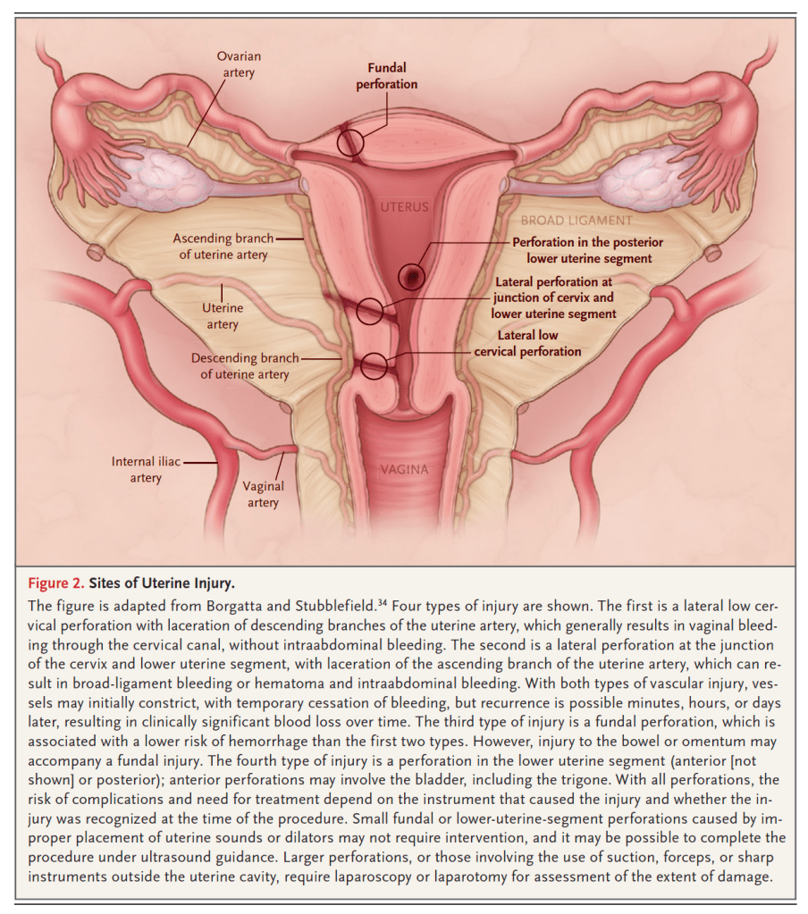- Surgical management for complicated perforations may require OB/Gyn and general surgery depending on whether there is bowel involvement