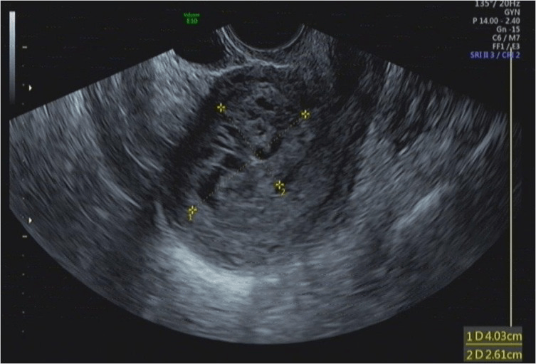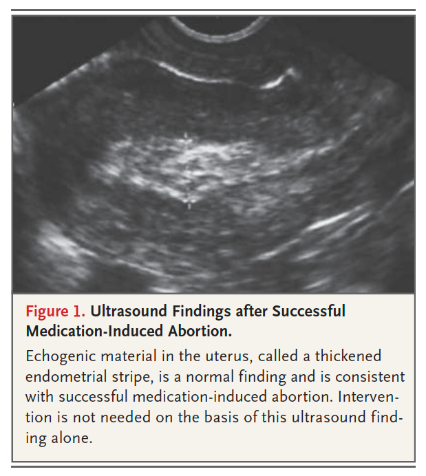 - Echogenic material in the uterus or a thickened stripe commonly seen after a medical or surgical abortion and should not immediately trigger further intervention