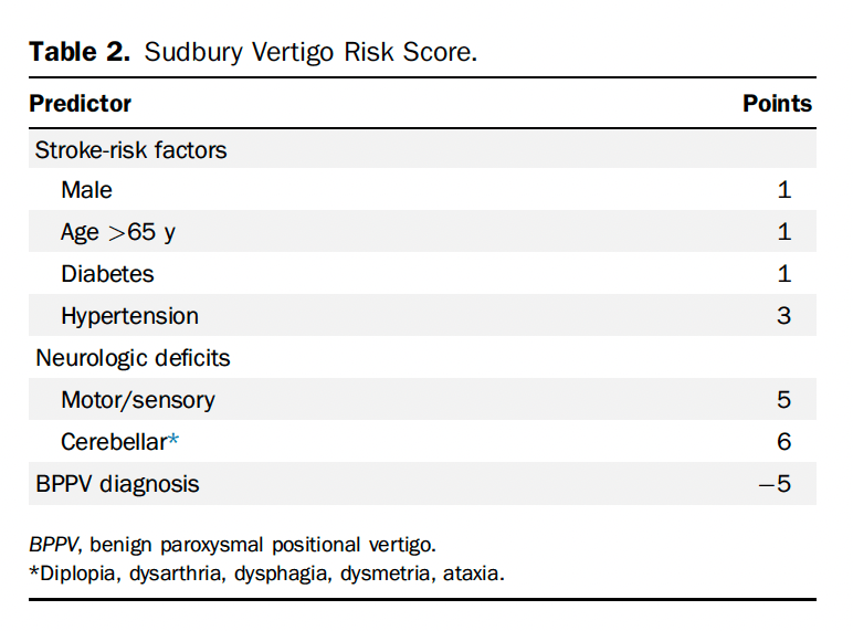 - EDITOR’S COMMENTARY: This study provides the first validation of the recently derived Sudbury Vertigo Score. The score performed very well: scores <5 were associated with 0% risk of serious outcomes, and most patients were in this category. This validation was conducted in a historical cohort of patients at the same 3 sites from which the rule was derived, through retrospective methods leaving much to be desired. I do not think that this rule can be applied to the bedside yet, but it holds promise for helping differentiate this difficult-to-assess patient population.