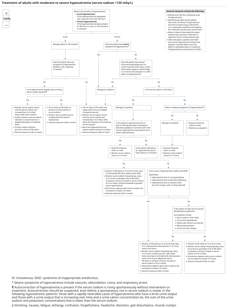 - Give a small amount of fluids; eg, 1 L of half-normal saline (1/2NS) or 5% dextrose in half-normal saline (D51/2NS) over several hours.